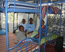 Boys stand with pride next to their new beds and curtains.