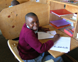 Peris at her school desk in By Grace working hard. She has no father. Her mother is extremely ill and unable to take care of her.